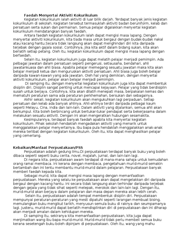 Kampung anda telah mengadakan gotong royong membersihkan kawasan kampung tuliskan sebuah karangan tentang pengalaman anda semasa menyertai gotong royong tersebut. Definisi kokurikulum mengikut kamus dewan ialah kegiatan atau aktiviti selain mata pelajaran yang diajarkan dalam bilik darjah tetapi yang dianggap sebagai sebahagian daripada kursus pendidikan pelajar di sekolah misalnya kegiatan dalam persatuan, unit unifom dan kegiatan kesukanan. Kementerian pelajaran tidak mahu para pelajar hanya menumpukan kepada pelajaran sehingga mengabaikan aktiviti kokurikulum. Pengalaman sebenar seperti menyertai ( 2 ) dan lawatan akan menambahkan lagi kefahaman murid tentang aktiviti luar ( 3 ). Menyertai aktiviti kokurikulum sangat banyak faedahnya. Kegiatan luar darjah ini berupaya untuk memberikan satu pperspektif baru kepada pelajar dalam menjalani kehidupan mereka di sekolah dan luar sekolah. Pengalaman ku menyertai perkhemahan unit beruniform sk mutiara. Melalui penglibatan dalam kokurikulum seseorang murid akan memperolehi banyak pengalaman baharu. Contohnya, jika kita aktif dalam bidang sukan, kita akan membuat. Badan beruniform dapat digunakan untuk mengisi masa. Cara menjaga kesihatan diri dan keluarga. Aktiviti kokurikulum merujuk aktiviti yang luar darjah yang melibatkan aktviti yang berpersatuan, lasak dan mungkin kemahiran tertentu. Saya telah menyertai pasukan pengakap sejak tingkatan satu lagi untuk menambah pengetahuan dan pengalaman kerana melentur buluh biarlah dari rebungnya.
