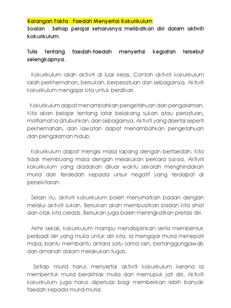 Kegiatan kokurikulum dapat didefinisikan sebagai kegiatan yang dijalankan di luar bilik darjah. Disiplin sangat penting untuk mencapai kejayaan. Antara aktiviti ini termasuklah persatuan, kelab, permainan, unit beruniform, dan sukan. Langkah langkah mengeratkan perpaduan di antara pelbagai kaum yang ada di malaysia ini sangat penting bagi mengelakkan berlakunya rusuhan antara kaum. Jelaskan kepentingan menjaga kesihatan diri. More sample bm essays for your benefit epic smart bangsar facebook. Kegiatan luar darjah ini berupaya untuk memberikan satu pperspektif baru kepada pelajar dalam menjalani kehidupan mereka di sekolah dan luar sekolah. Cara menjaga kesihatan diri dan keluarga. Contoh karangan pengalaman menyertai aktiviti gotong royong. Sebenarnya, kegiatan kokurikulum biasanya dijalankan selepas waktu belajar atau pada hari. Pengalaman ku menyertai perkhemahan unit beruniform sk mutiara. Antara aktiviti ini termasuklah persatuan, kelab, permainan, unit beruniform, dan sukan. Karangan gotong royong di rumah bersama keluarga.