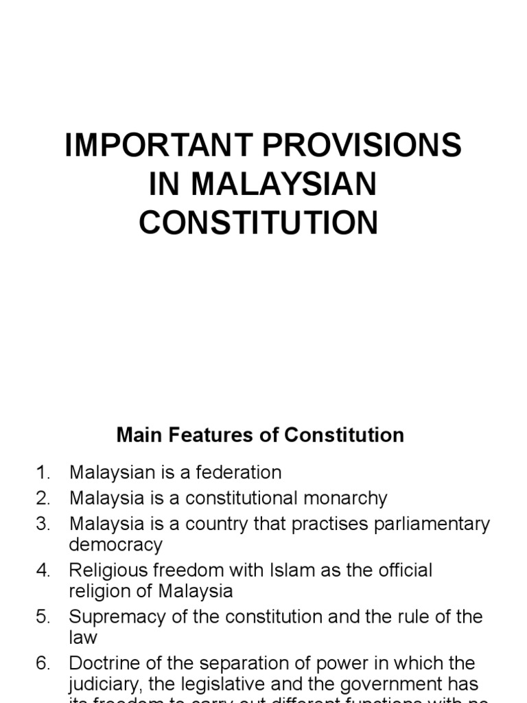 Main Features Of Malaysian Constitution - Constitutional Supremacy Theory Versus Reality No 2 Of A Series Of Essays By The Tun Hussein Onn Chair In International Studies Isis - —dian a h shah —jaclyn l.. The federation of malaya agreement that served since the main for the existing federal approach to central govt was deducted as a bargain to the. The building blocks of the constitution of malaysia was laid on 10 september 1877. Federal constitution of malaysia introduction as indicated by (aun, 1999) malaysia is an alliance of thirteen states and two government regions. Neo, national university of singapore* the malaysian constitution does not have a preamble. Today, the malaysian constitution still promises to safeguard the special position of the malays and natives of any of the states of sabah and sarawak. the document considers all malay to be muslims, and multiple governments have pushed for policies which benefit islam over malaysia's two main.